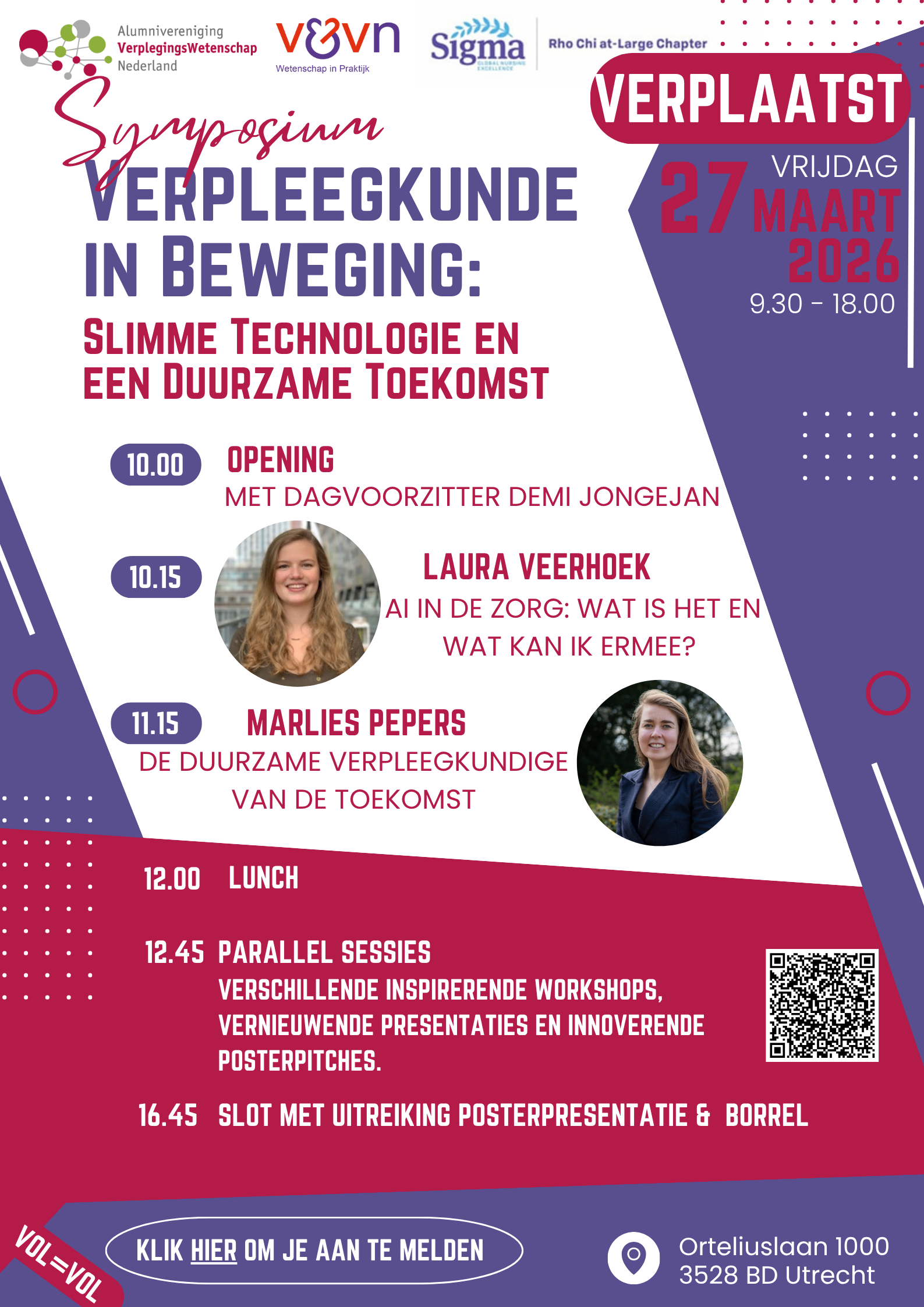 Het symposium "Verpleegkunde in Beweging: Slimme Technologieën en een Duurzame Toekomst" is verplaatst naar 27 maart 2026. Meld je aan voor dit interessante symposium via deze link of de QR code op de poster.